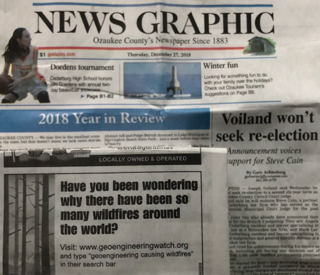 Geoengineering Watch wishes to thank Laura Kozicki for her ongoing efforts to sound the alarm in Wisconsin. This most recent newspaper ad shown was placed by Laura in the Ozaukee County Newspaper on December 27th, 2018.