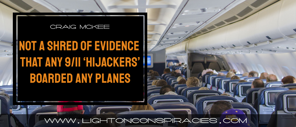 No witnesses to boarding: There are simply no witnesses who can state that any hijackers actually boarded any planes. No ticket takers, no security personnel, no one. In fact, there is no one who makes a credible claim to have seen any of them at boarding gates or security checkpoints either – even though the 9/11 Commission Report states (p.451) that 10 of the 19 were selected by an automated system for additional security screening. And the collection of knives and box cutters that they allegedly used to take over the planes were somehow not detected either by electronic screening or through individual searches.
