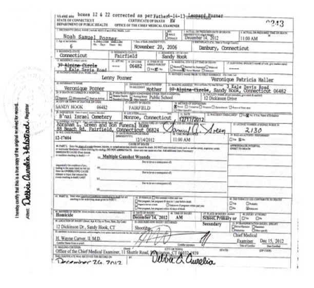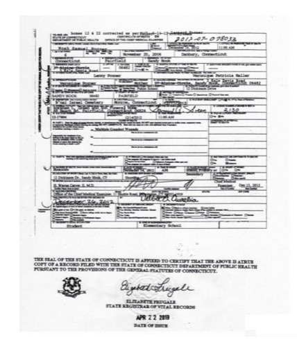 The death certificate for which I am being sued is the one published in the book,Nobody Died at Sandy Hook: It was a FEMA Drill to Promote Gun Control, which has appeared as Chapter 11 co-authored with Kelley Watt in both first editions (2015) and second (2016). It is an expanded and revised version of an article that I originally published on Veterans Today(6 August2014), which included the death certificate for my characterization of which I have been sued. Kelley said it came from “Lenny”. I published it in VT and with Mike Palecek in both editions and we made no changes to its content.