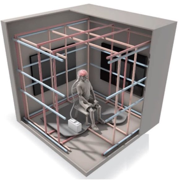 Schematic drawing of the human magnetoreception test chamber at Caltech.Modified from ‘Center of attraction’ by C. Bickel (Hand, 2016).