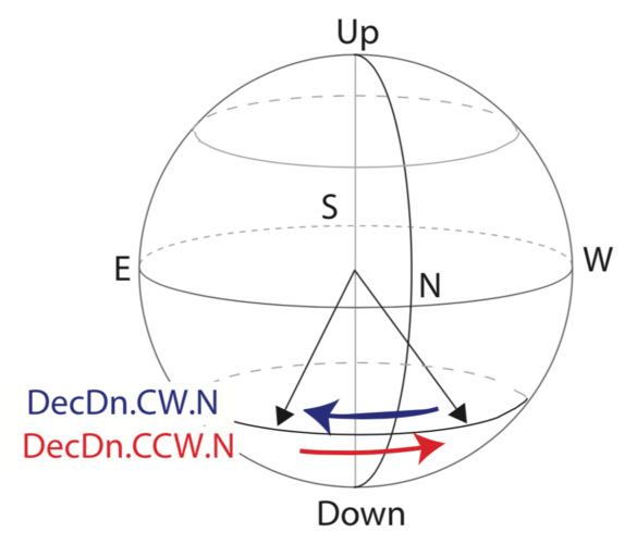 Study participants sat in the experimental chamber facing north, while the downwards-pointing field rotated clockwise (blue arrow) from northwest to northeast or counterclockwise (red arrow) from northeast to northwest. Magnetic Field Laboratory, Caltech, CC BY-ND